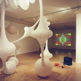 Non Stop Unfold, installation view, Transtube System - ricepaper lamps, Unfold - video, Feedback soundtrack - soundinstallation. Index - The Swedish Contemporary Art Foundation, Stockholm, 2001. |