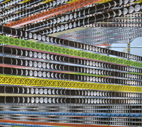 Cosmic Matter, scaffolding, printed tape, high-polished metal. Bonniers Konsthall, Stockholm, 2009. |